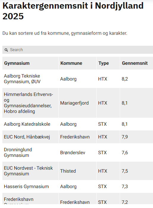 I Nordjylland indtager Aalborg Tekniske Gymnasium (HTX) en flot førsteplads med årets højeste gennemsnit på 8,2. Mens Himmerlands Erhvervs- og Gymnasieuddannelser i Hobro (HTX) og Aalborg Katedralskole (STX) ligger lige i hælene med et gennemsnit på 8,1.