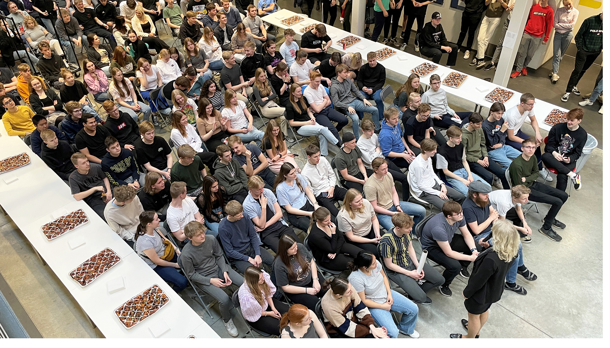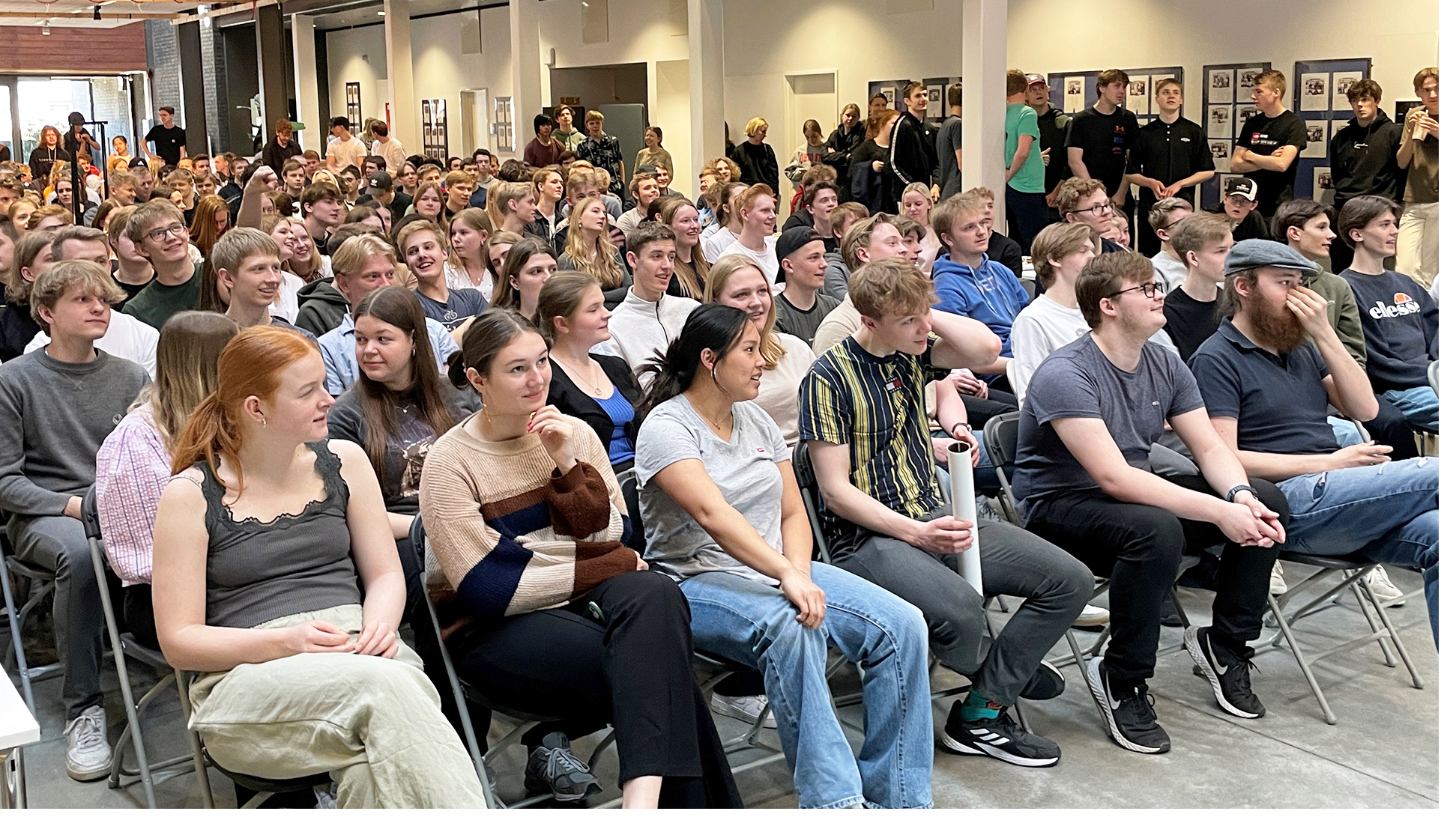 - Nu skal vi lige huske, hvordan vi gjorde før corona, siger uddannelseschef Elida Westergaard Christensen fra ”scenen” og hentyder til, hvordan eleverne skal finde sig til rette på klapstole foran hende i en fyldt aula.